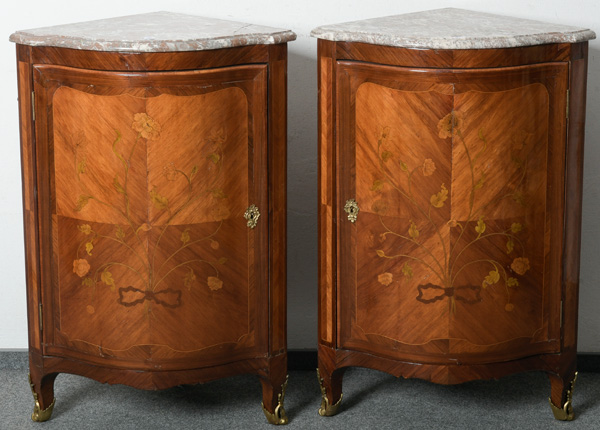 Paar Louis XV-Echschränke. Paris um 1775. Weichholzkorpus, furniert mit Mahagoni und exzellent floral marketiert, teilw. graviert; eintrüige Front mit Marmorabdeckplatte (H=88 cm, ST=43,5 cm). Provenienz: Im Jahre 2000 im Pariser Kunsthandel für EUR 12.000,00 erworben. (eine Platte besch.)