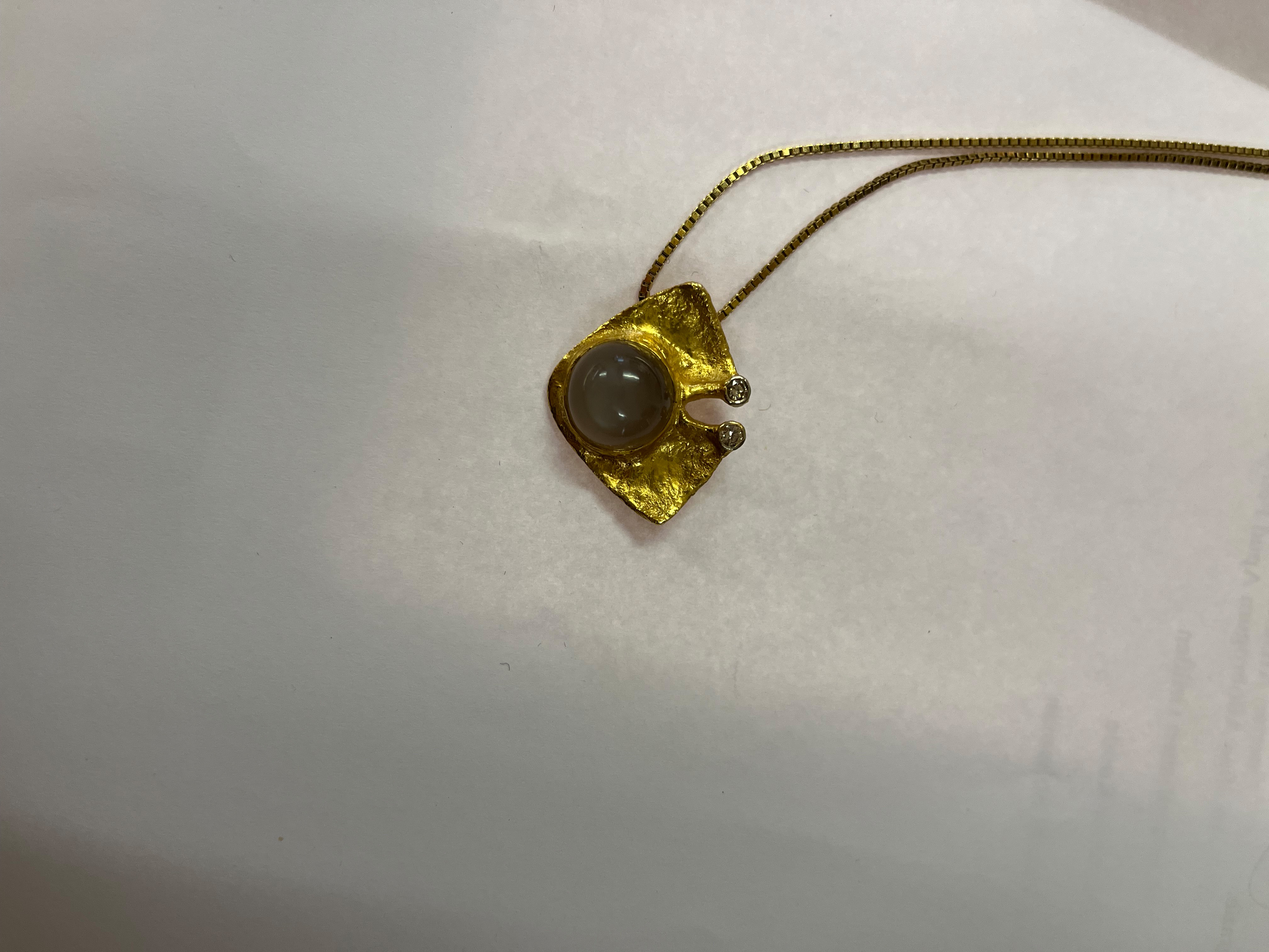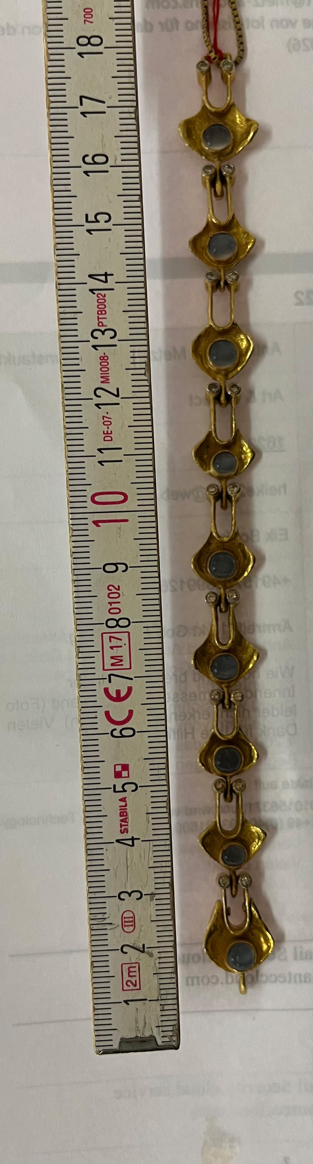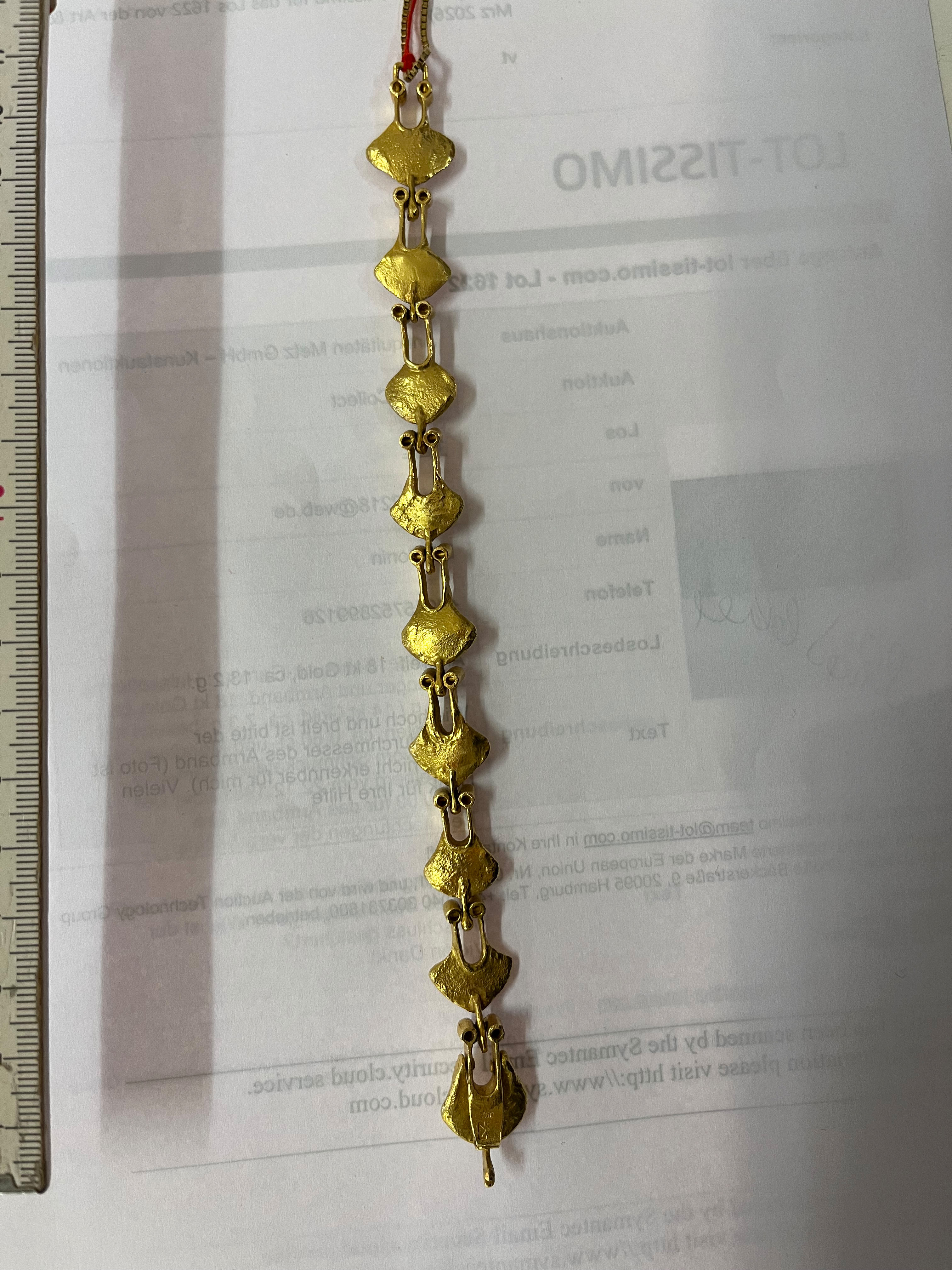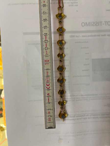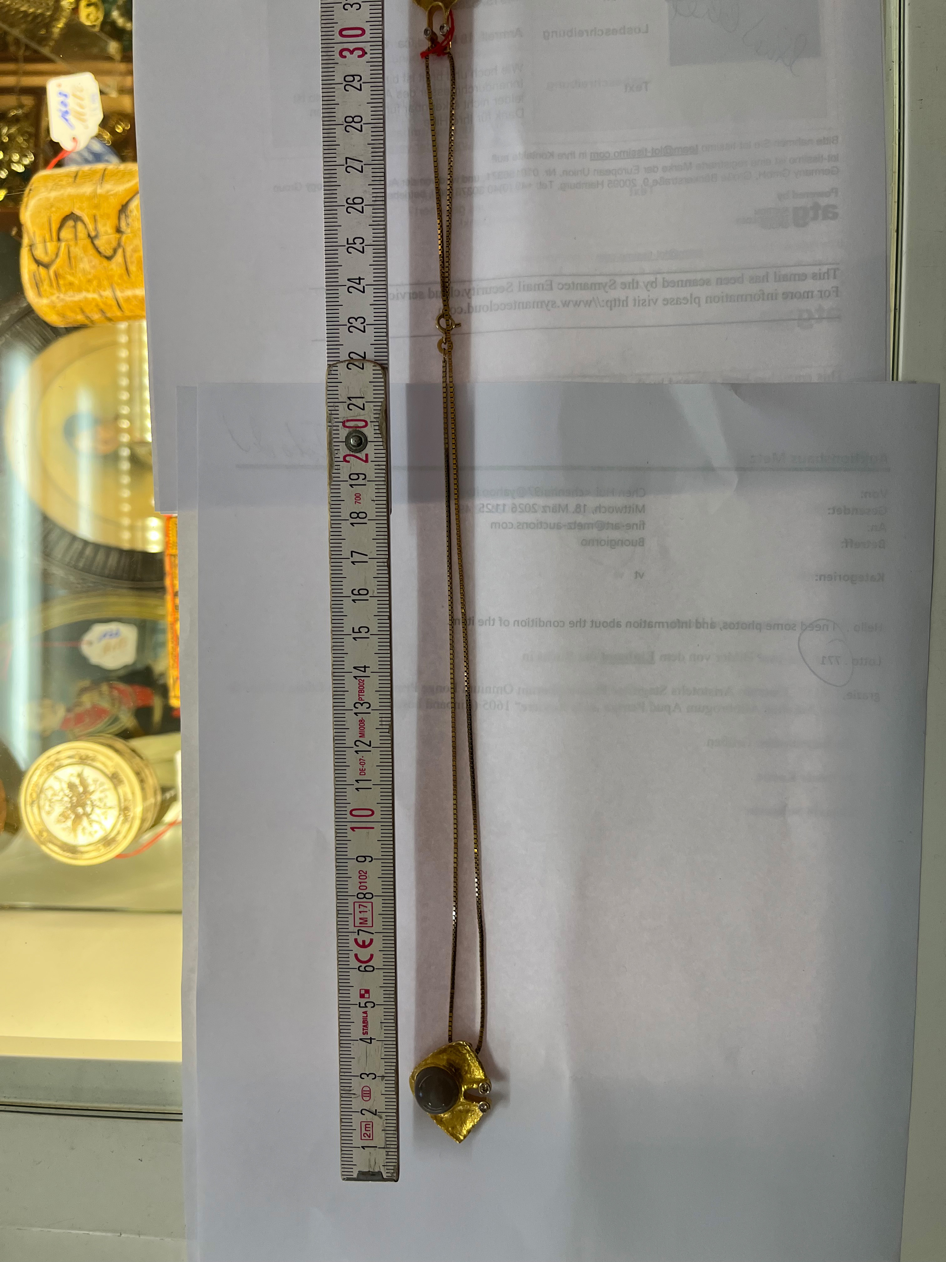 - Katalog-Nr: 235Zweitlge. Schmuck-Garnitur: Halskette mit Anhänger und Armband. 18 kt Gold, ca. 37,0 g / 14 kt Gold, ca. 7,3 g, besetzt mit Brillanten, ca. 0,60 ct, und Mondstein. Mit Beleg vom Schmuckatelier Mämecke, Heidelberg vom 22.12.1981 über DM 4.260,00 für das Armband. Die Begutachtungen der verarbeiteten Edelsteine und Diamanten wurden im gefassten Zustand vorgenommen, d.h. unter Vorbehalt einer sachgerechten Graduierung, die nur an ungefassten Steinen erfolgen kann. Dies hat zur Folge, dass die Gewichte (sog. "berechnete Gewichte", d.h. ca.+/- 10 % Abweichung) und Qualitäten (Farbe, Reinheit und Schliff) der Steine nur annähernd angegeben werden können.o.L.Bitte melden sie sich an, um ein elektronisches Vorgebot abzugeben