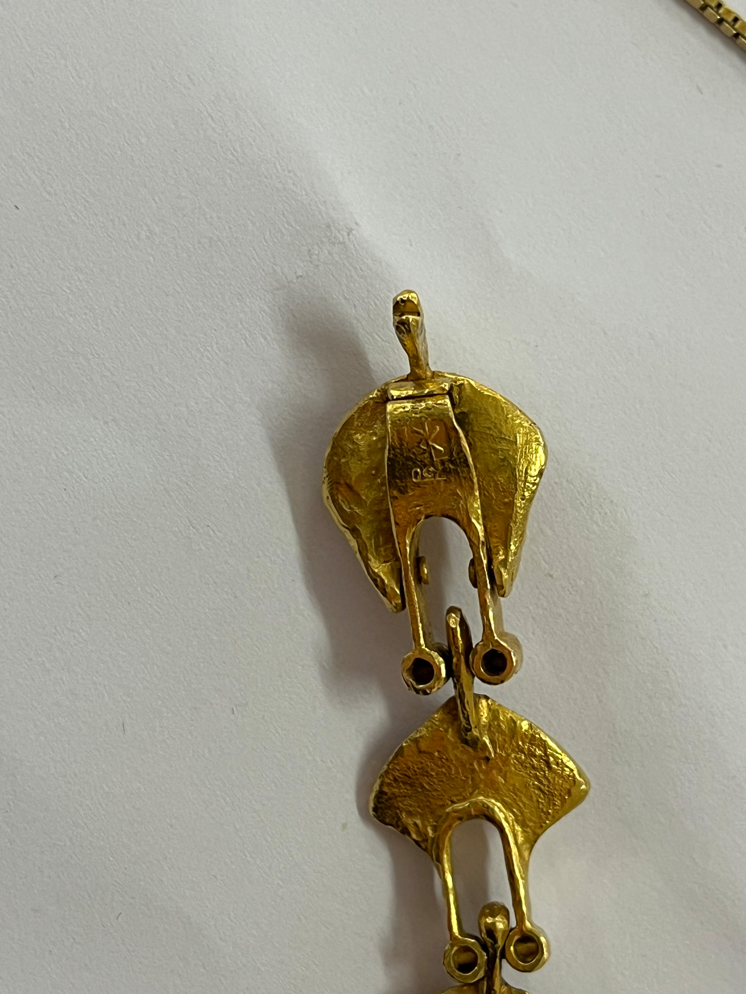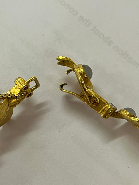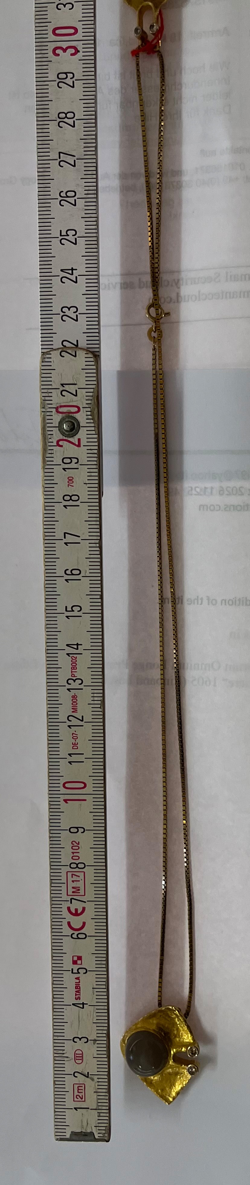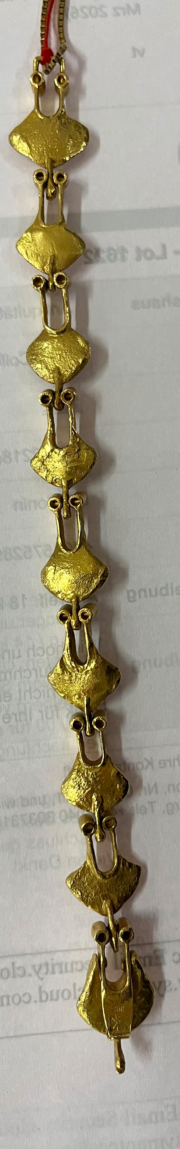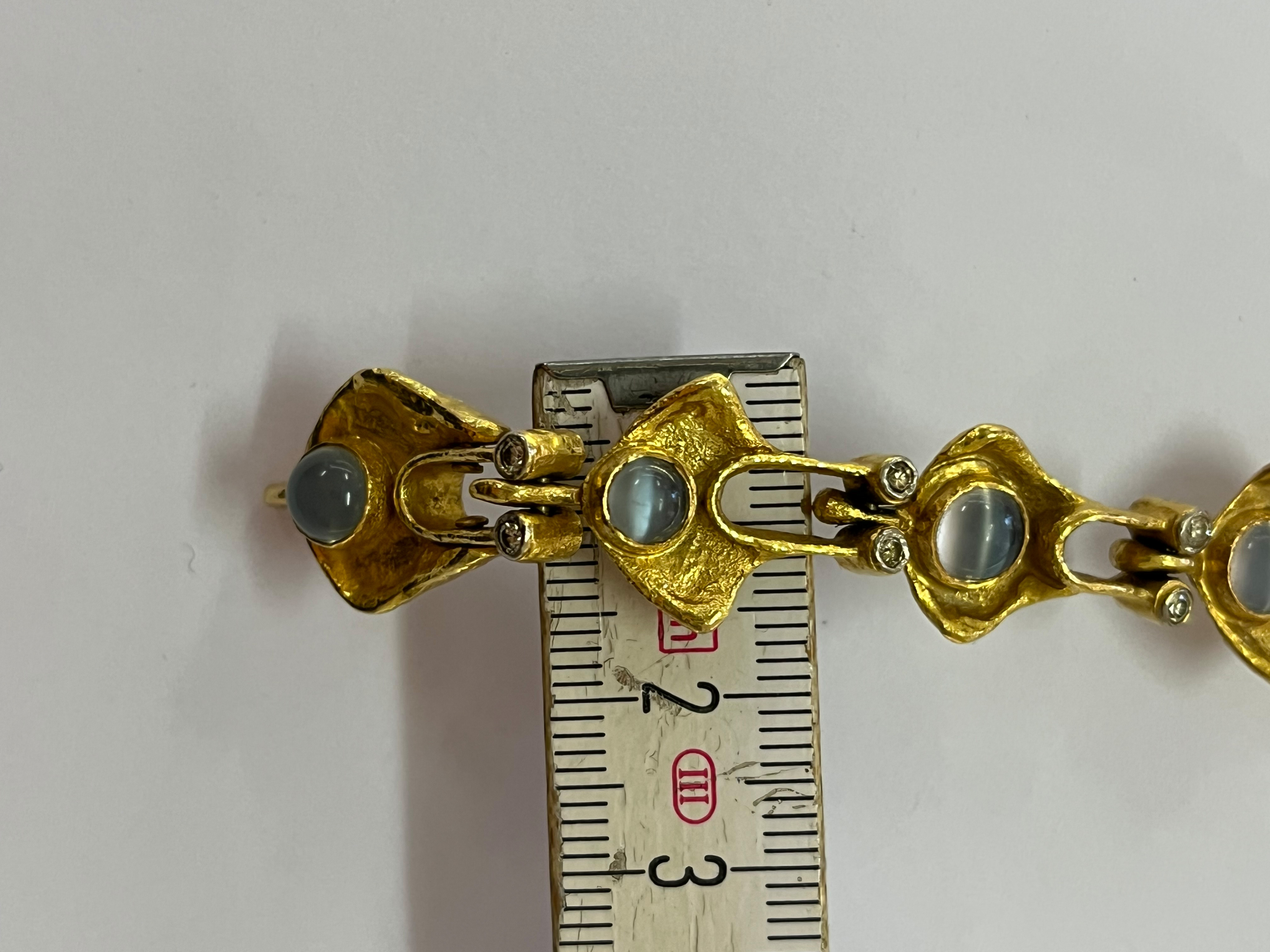 - Katalog-Nr: 235Zweitlge. Schmuck-Garnitur: Halskette mit Anhänger und Armband. 18 kt Gold, ca. 37,0 g / 14 kt Gold, ca. 7,3 g, besetzt mit Brillanten, ca. 0,60 ct, und Mondstein. Mit Beleg vom Schmuckatelier Mämecke, Heidelberg vom 22.12.1981 über DM 4.260,00 für das Armband. Die Begutachtungen der verarbeiteten Edelsteine und Diamanten wurden im gefassten Zustand vorgenommen, d.h. unter Vorbehalt einer sachgerechten Graduierung, die nur an ungefassten Steinen erfolgen kann. Dies hat zur Folge, dass die Gewichte (sog. "berechnete Gewichte", d.h. ca.+/- 10 % Abweichung) und Qualitäten (Farbe, Reinheit und Schliff) der Steine nur annähernd angegeben werden können.o.L.Bitte melden sie sich an, um ein elektronisches Vorgebot abzugeben